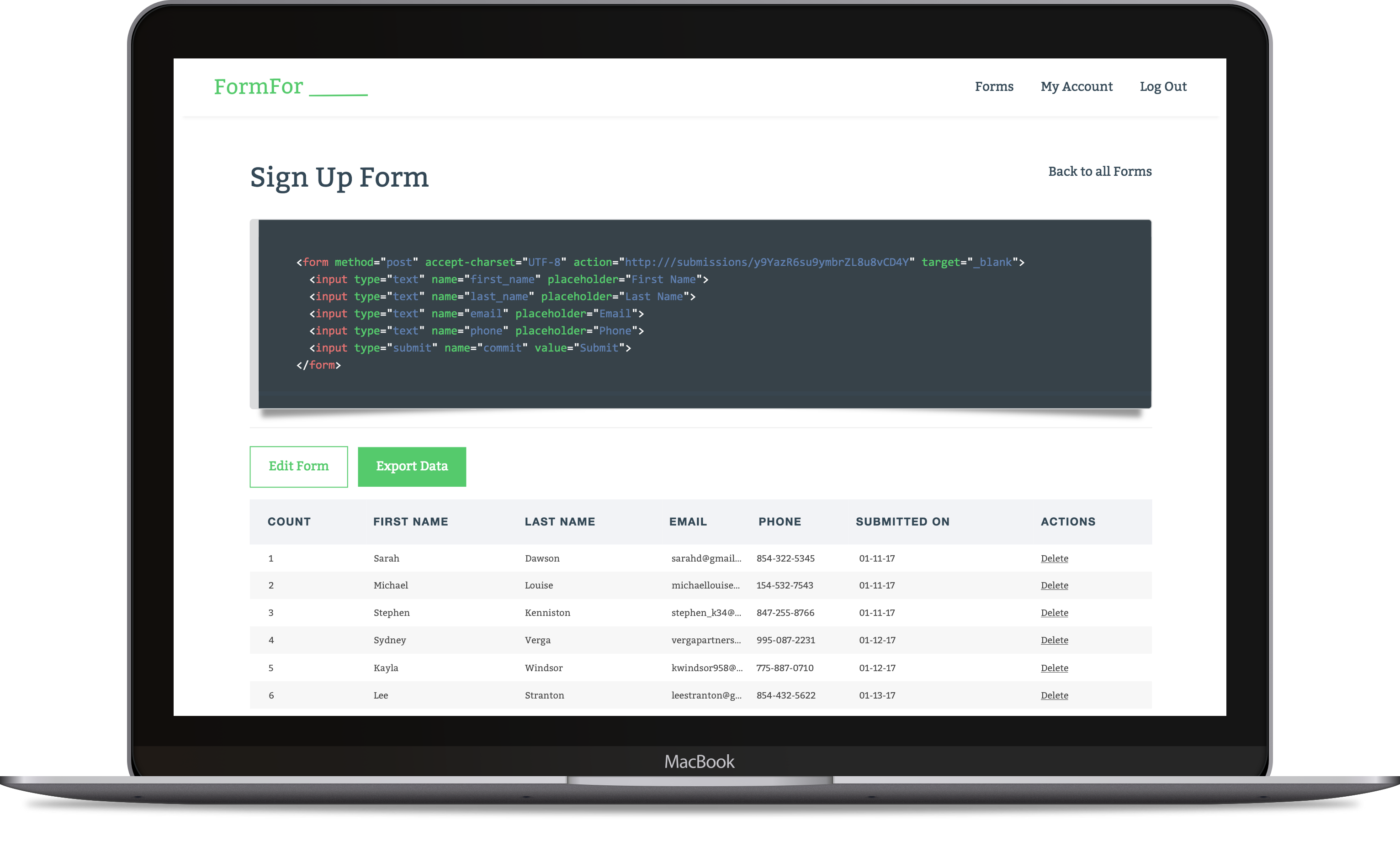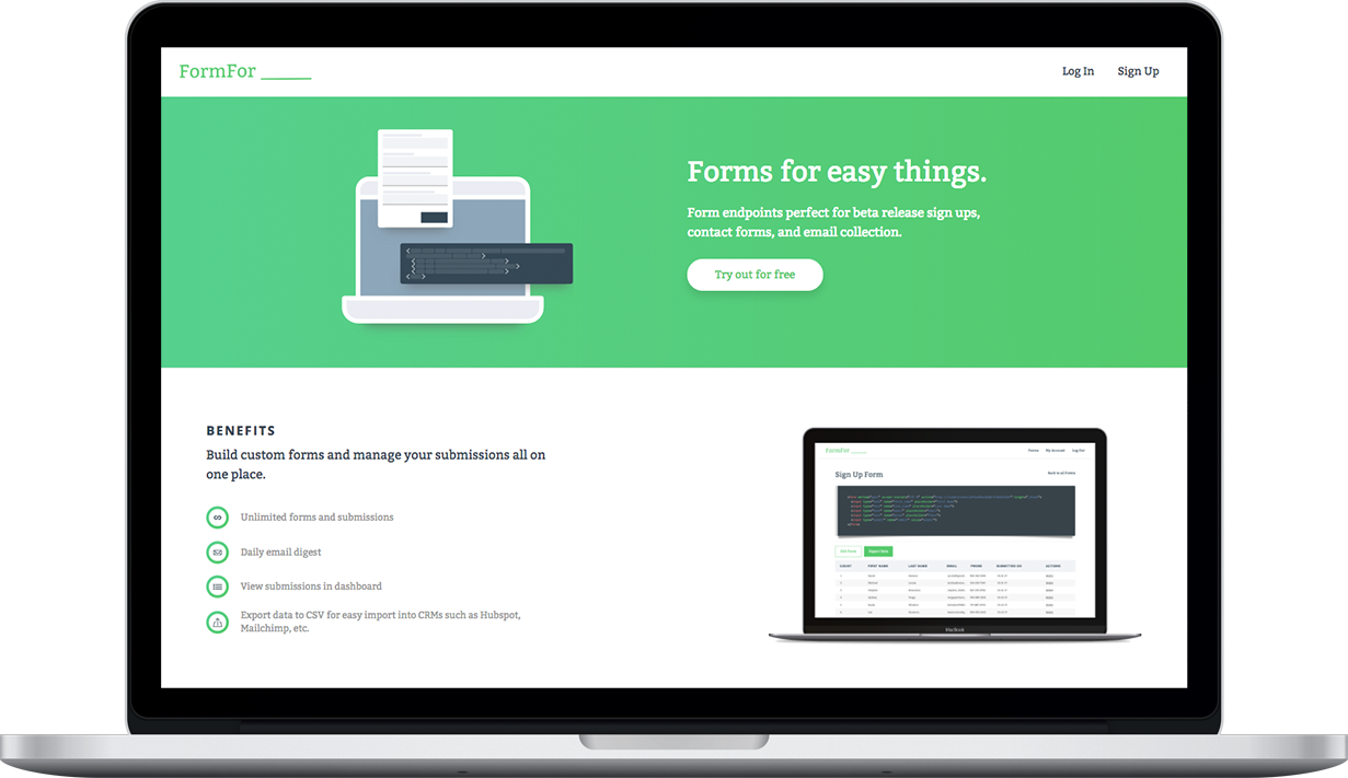 Since the backend was already completed, we decided to polish it off and turn it into a product, Formfor. The key features we need to include, aside from the baseline ability to create a form endpoint, were to have a dashboard to view submissions and to allow for unlimited form creation. We also wanted to learn a little bit more about true SaaS products and how best to model, design, and build monthly subscription services. We hope you like what we have come up with!