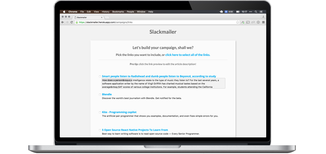 Since Slack is where we share our links internally, we thought why not use that content to populate a newsletter? There’s no sense in trying to gather up all of those links again and manually entering them into a MailChimp template when you can build a Slackbot to do the work.